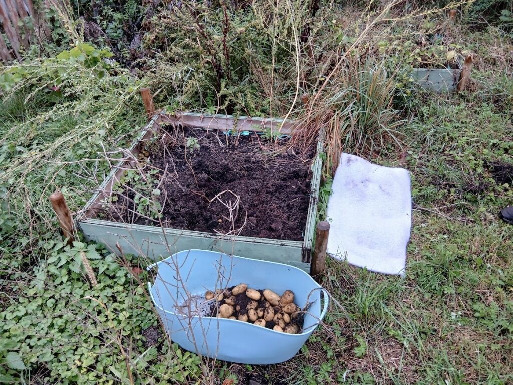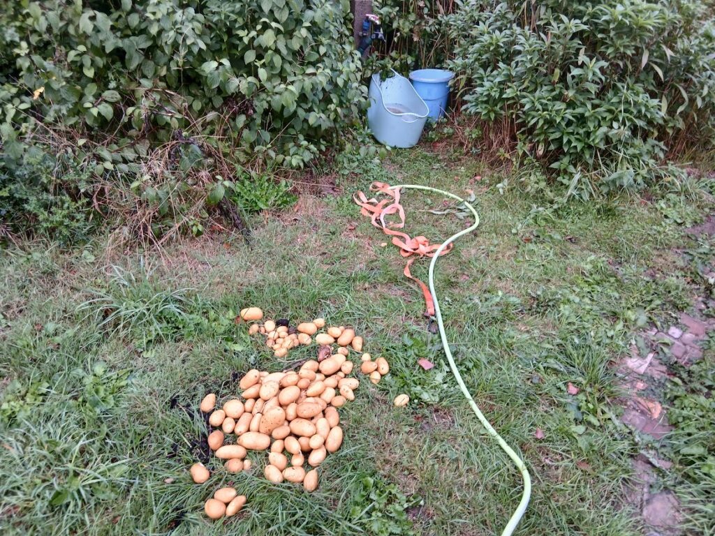 Dit is de aardappeloogst van 2025. Bij de Pinowagen ook 5 groentebakken. Ieder jaar bijv. de aardappels in een andere bak, dan geen ziektes. Dit jaar prei, aardappels, uien en wortels. Goed voor een lekkere stamppot komend najaar. Wij poten en oogsten de inhoud van 4 bakken.